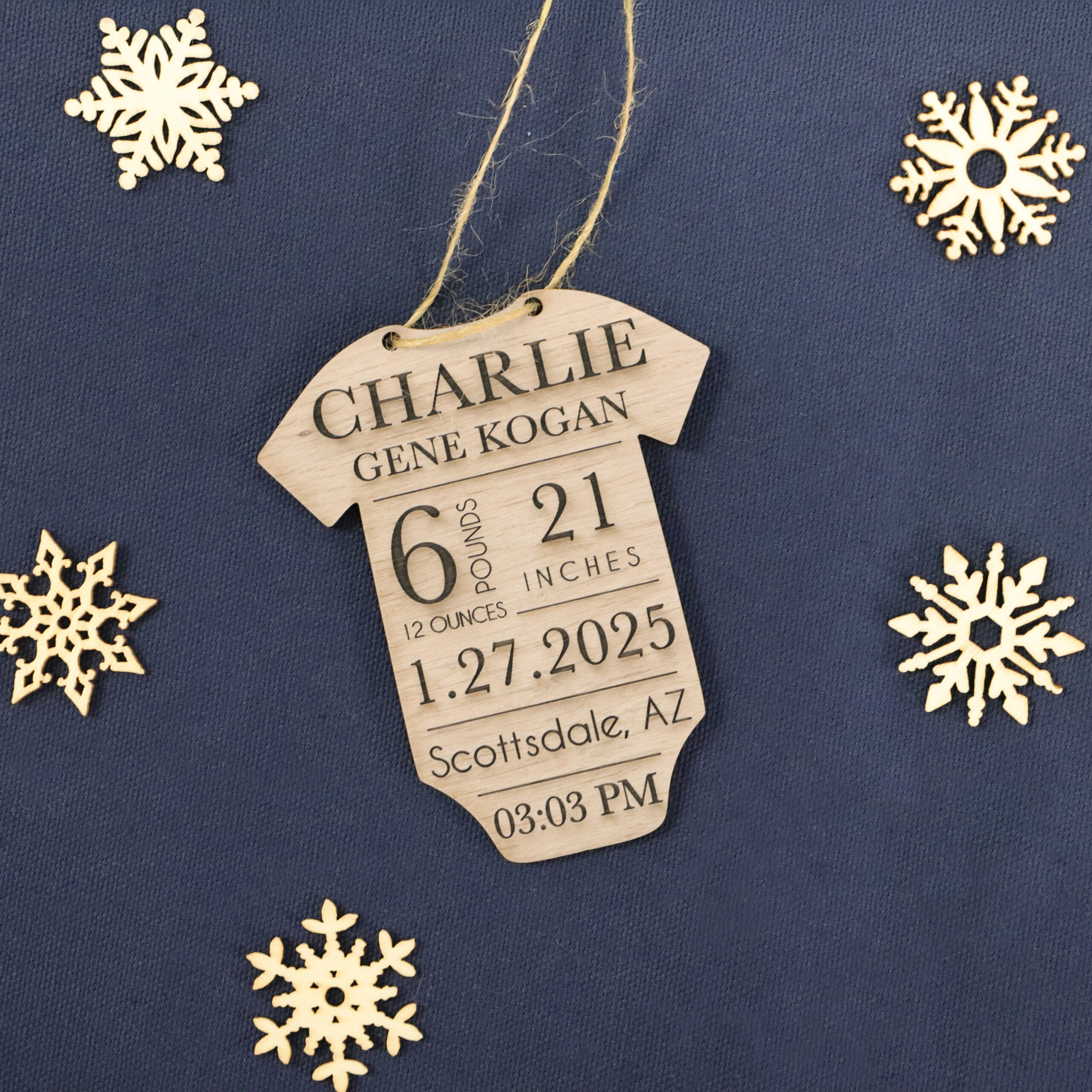 Trim your tree, tag your gifts, or label your stockings with the Baby Onesie Ornament! Laser engraved with custom birth information in serif font. Made to order with genuine Alder wood.
